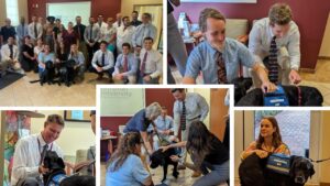 NUHS Tri 8-10 Interns all together for a surprise encounter with therapy dogs. Lower left: Dr. Strauss making friends with Sloopy.